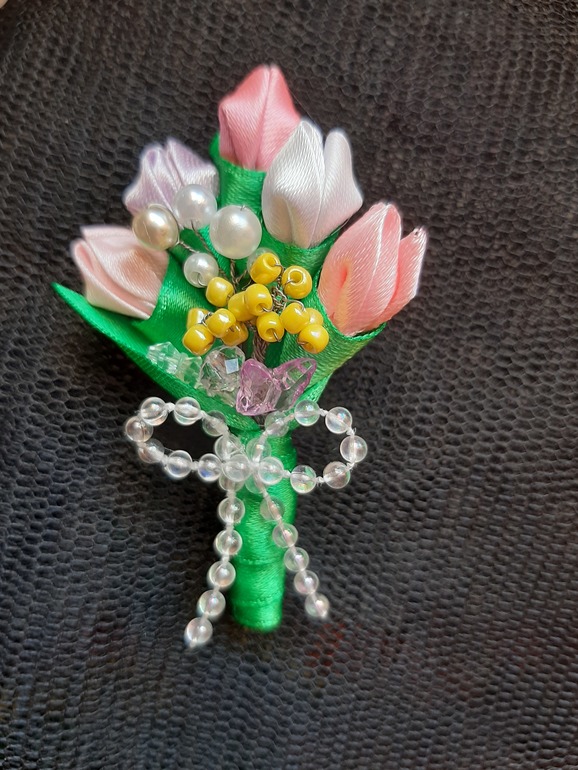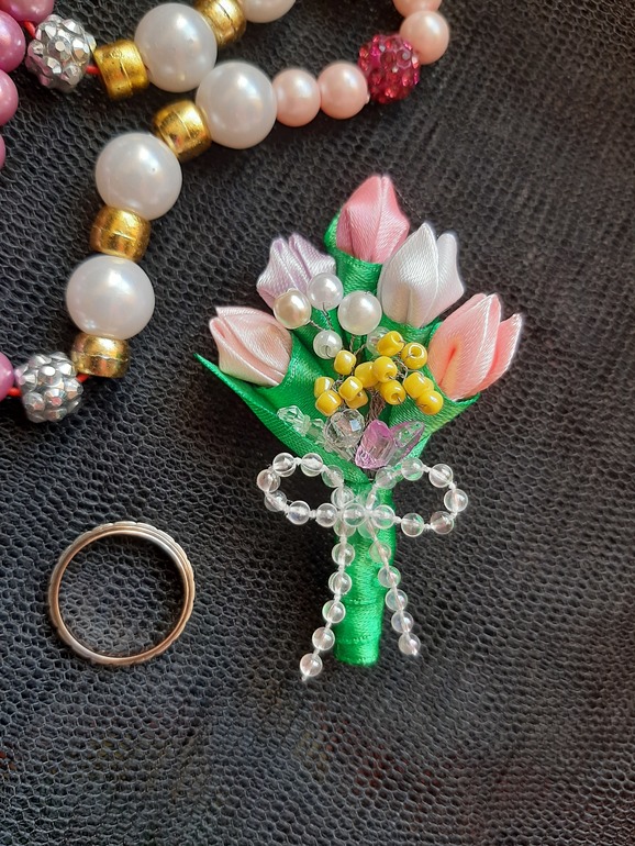 Это подруга попросила сделать брошь с тюльпанами на подарок учительнице. Получилась миниатюрная такая, колечко для масштаба.