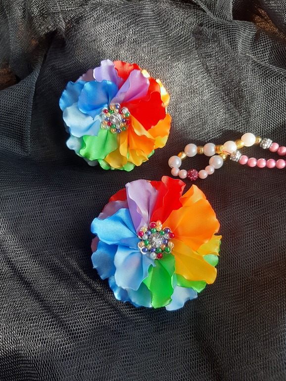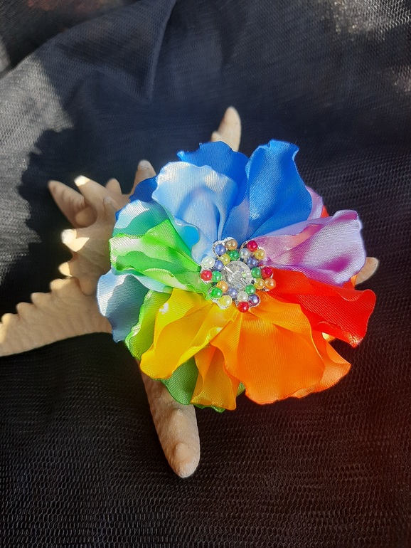 Люблю радугу делать, она настроение поднимает! Лепестки по спирали уложены, основа - резинки.