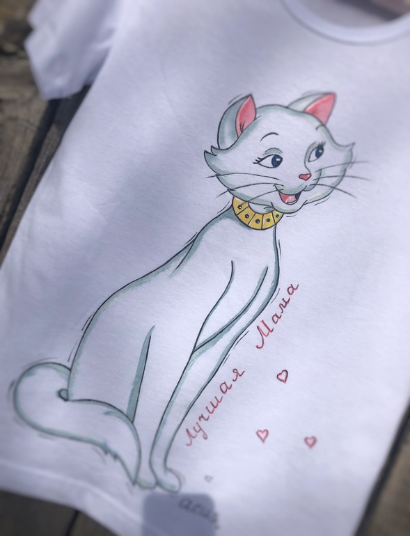 Женская футболочка с героиней диснеевского мультика «Коты Аристократы». Роспись по ткани стойкими красками. Будут ещё футболочки для девочек в комплект с мамой в стиле family look.