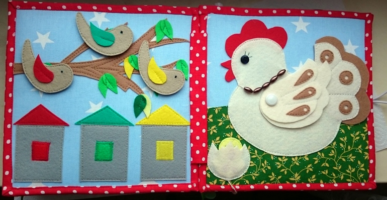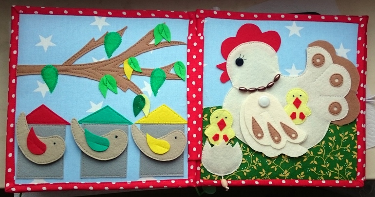 Третий разворот.Птички на веточке и курочка с цыплятами.
