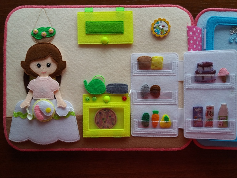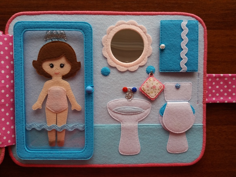 Добрый день! Хочу показать Вам кукольный домик. Размер 24×18,5 см. 4 страницы: прихожая, кухня, ванная и спальня. Размер куколки 12 см. 10 нарядов, одежда крепится на магнитах. Куколку можно кормить, купать, наряжать.