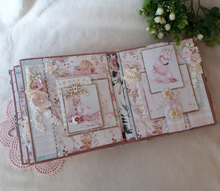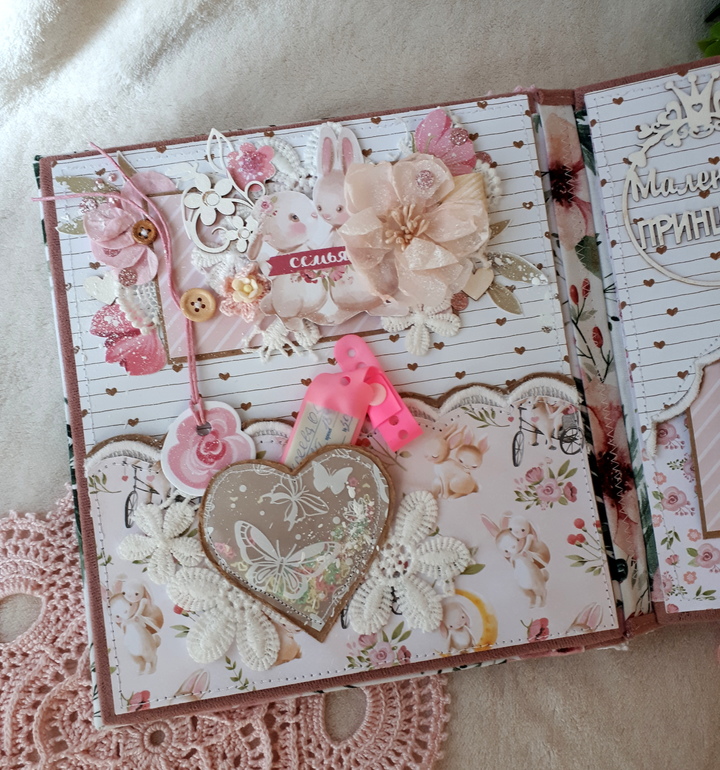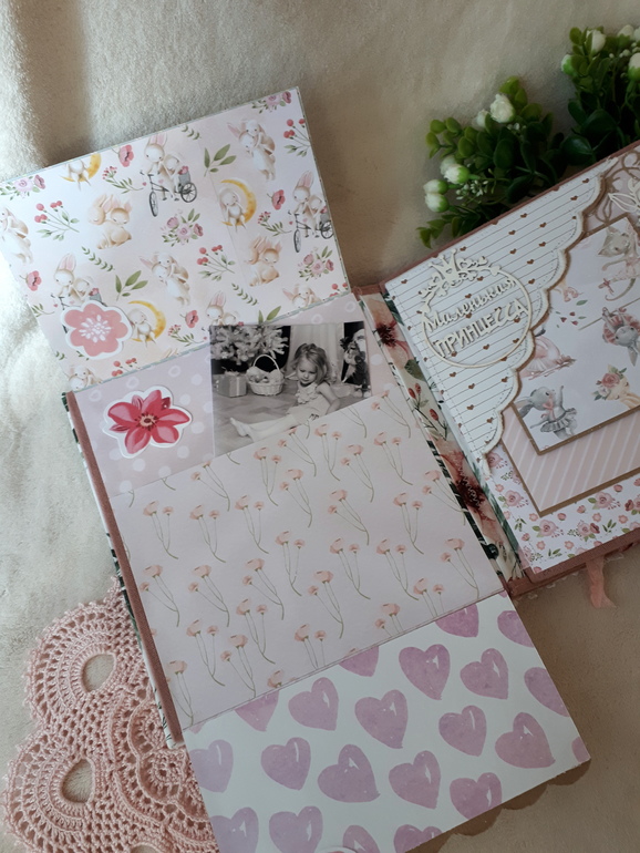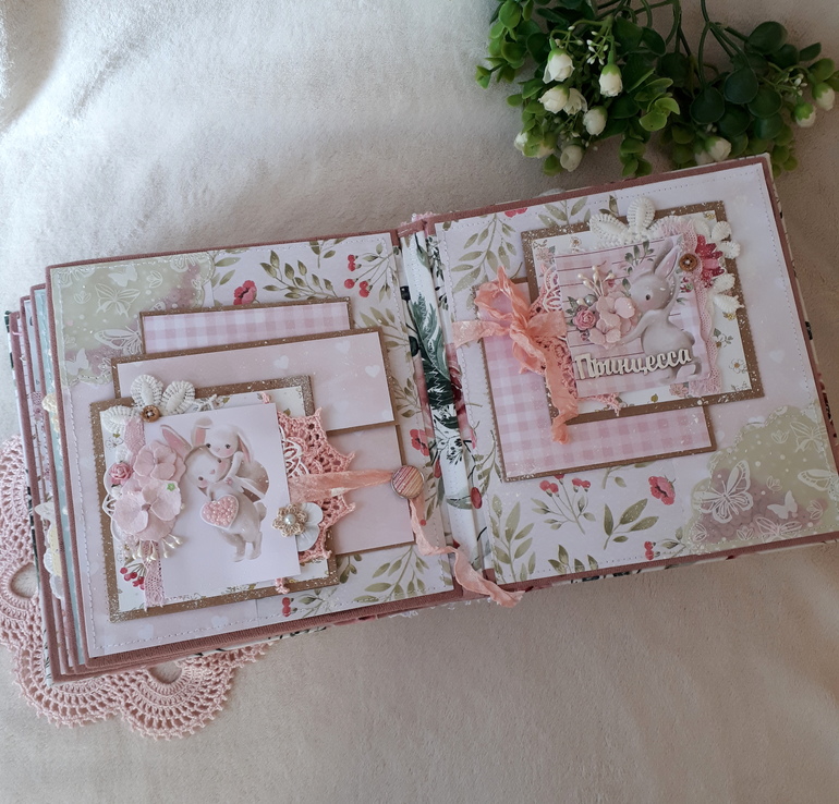 СкрапбукингДоброго дня! Хочу показать вам мой новенький альбом для девочки! Нежный, без привязки к возрасту-подойдет как для фото первого года, так и для любых любимых фотографий малышки. 4 разворота, вместит более 40 фото 10х10, и дополнительные места для фото другого размера. Декорирован цветами, кружевом, вязаными украшениями, шейкерами и поп-ап конструкциями. Прошивной переплет!!! Далее много фото!