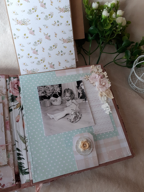 На первом развороте есть малыш-шейкер, куда можно спрятать бирочки или еще какую-нибудь небольшую памятную вещичку., левая страничка раскладывается, внутри есть вместительный карман для фото и место для вклеивания фотографий разного формата, на правой страничке магнитная застежка, а по фото прячется поп-ап конструкция как в книжках из нашего детства!