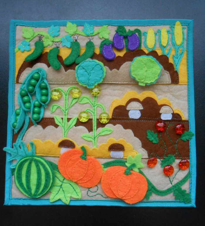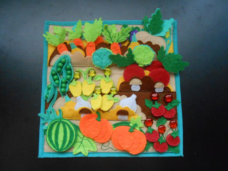 Есть крючки, кнопки, липучки и пуговки. Кукуруза, грибы и горох вшиты. Всё остальное съемное. Все овощи, которые не на липучках, двусторонние. Большие листики внизу странички можно отгибать пальчиками. Можно перебирать горох - стручки пришиты только за верхушки. Грядки сделаны карманчиками, чтоб можно было сажать овощи.
