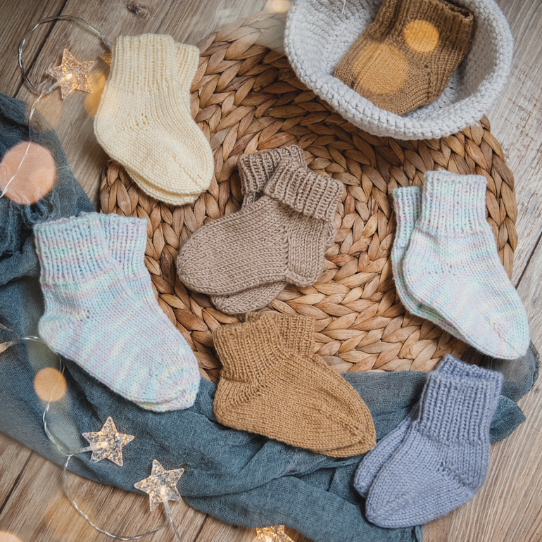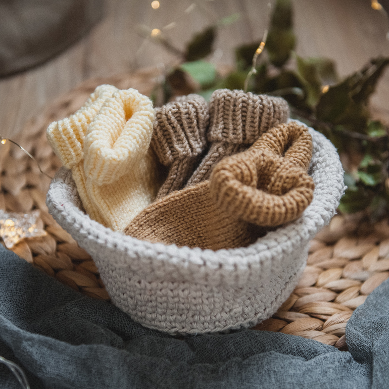 Заказ пришел от девочки, которая изготавливает деревянные игрушки для малышей. Решила она сделать подарочные коробочки для новорождённых. Грызунки, погремушки, еще что-то мимишное (честно - не помню, что еще она туда положила) и носочки. Вот носочки я и вязала. Получились мягонькие, как пух) И цветовая гамма такая приятная.