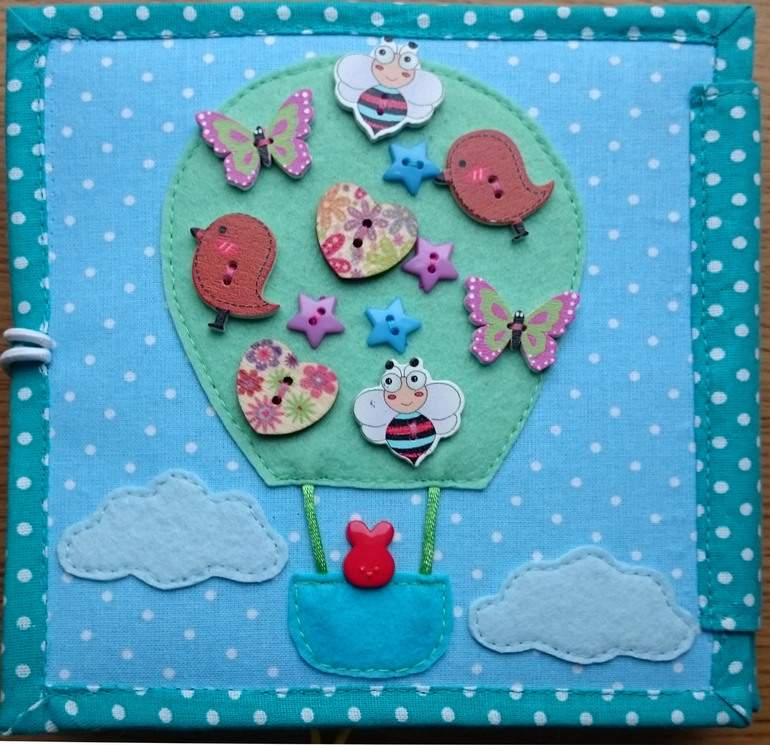 На лицевой обложке зайчик, на магнитной кнопке,декоративные пуговицы.