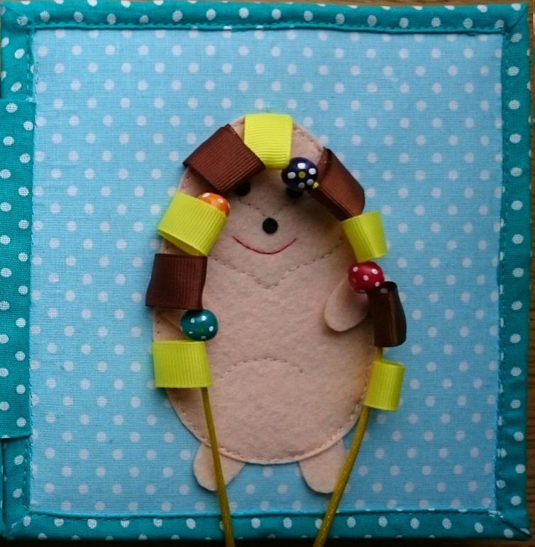 Ёжик.Тянем за тесьму и ёжик прячется в "иголочках".Бусинки проталкиваем через ленточки.