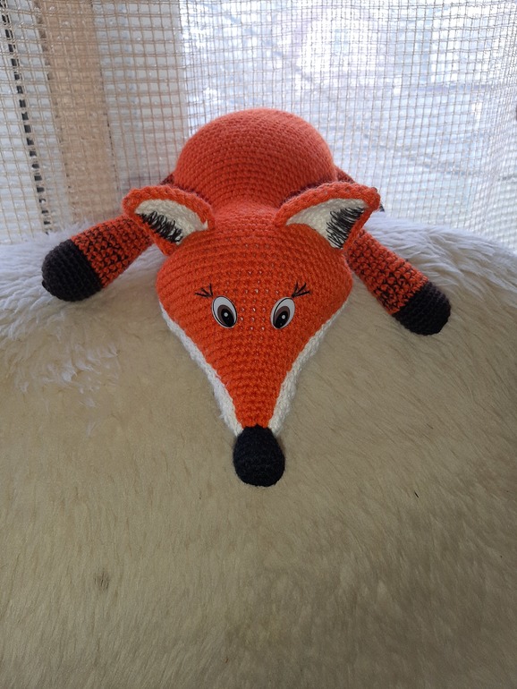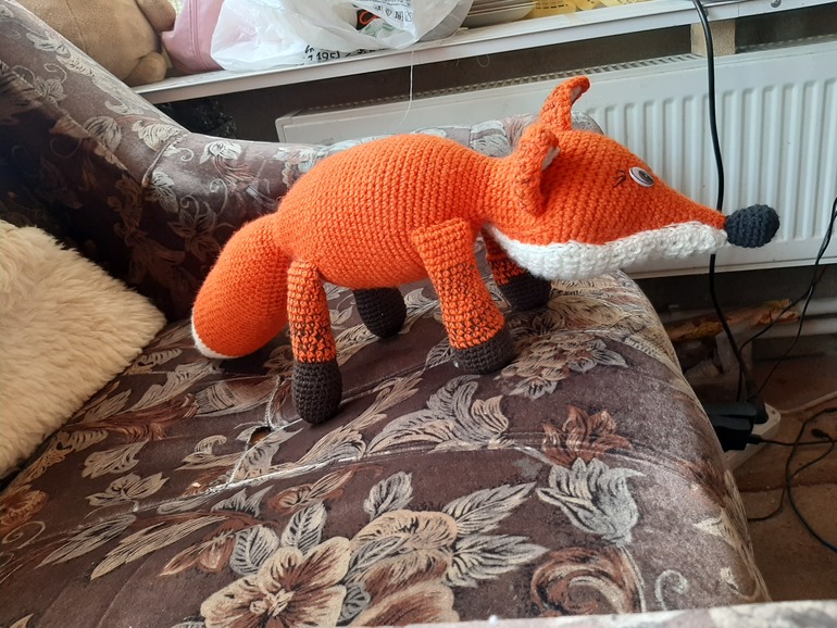 И вот, что получилось. Вязала полностью из головы, так сказать, по ходу мысли, распуская и продолжая. Заказчик доволен, я тоже. В реале рыжий не такой яркий, немного в терракот. Не планировала, чтобы она стояла, но она сделала это!