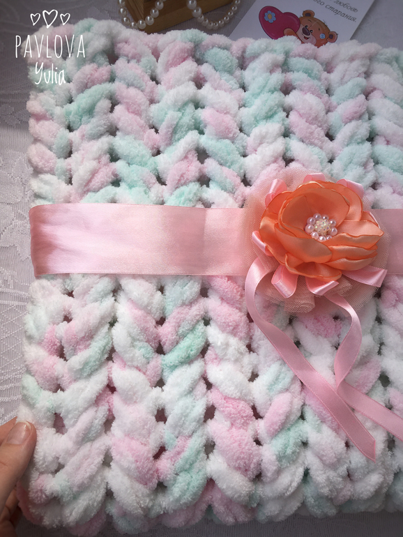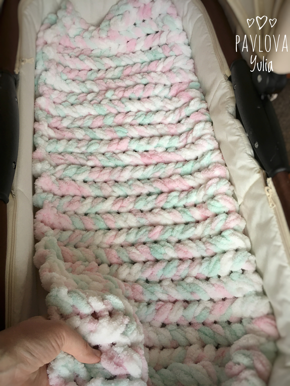 Вязание на руках (без специальных инструментов)Всем привет. Связала нежнейший плед в коляску для своей малышки. С этой пряжей хорошо знакома. Помимо приятных цветов, и гипоаллергенности она еще прекрасно стирается в машинке и быстро сохнет.