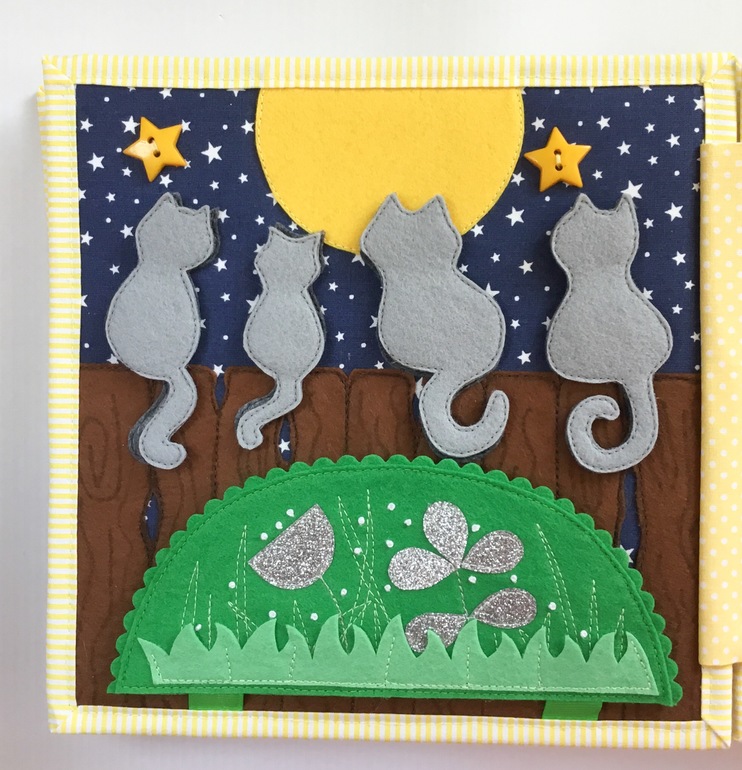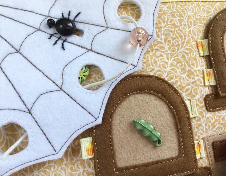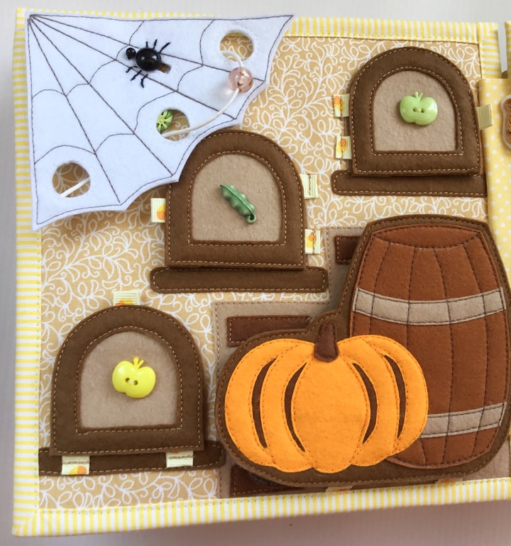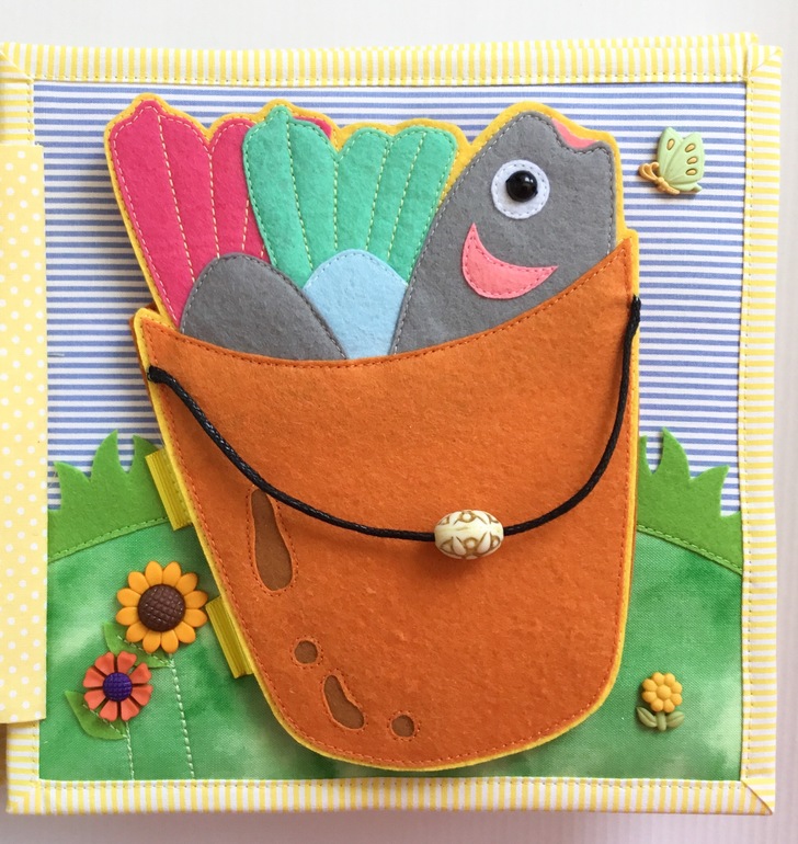 Книжка сшита из фетра и ткани. Размер страничек 20*20см. Съемные детали хранятся на велкропланшете.