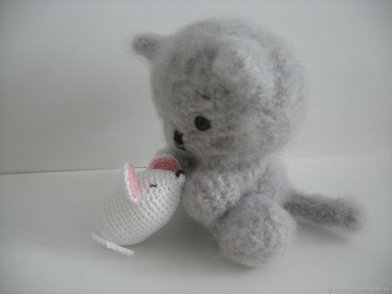 Котенок с мышкой. Котенок размером около 10 см, пряжа акрил+полиамид, глазки на винтах; мышка -хлопок. (Этот слоник может быть отправлен в августе)