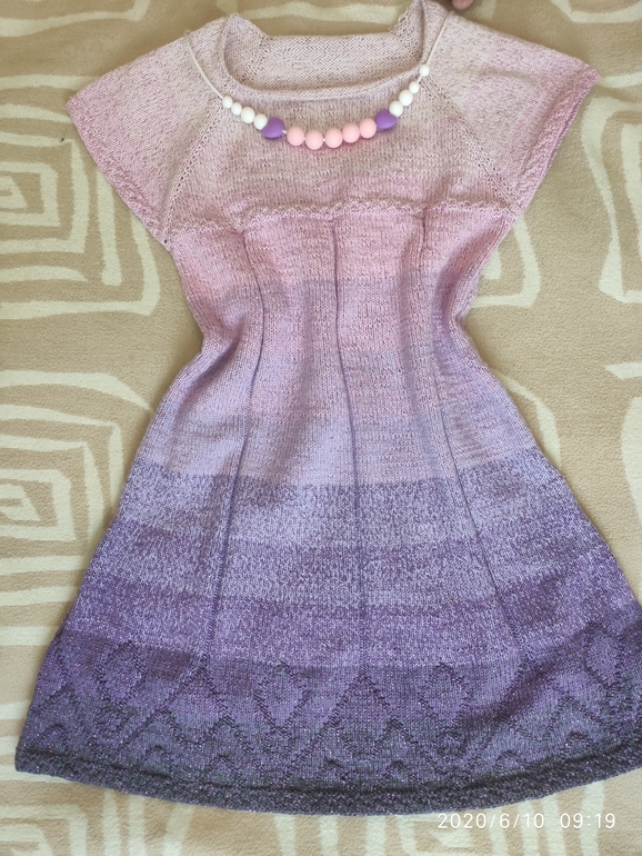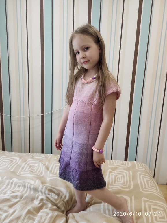 Вязание спицамиСвязала платье для Ани. Пряжа YarnArt Flowers Moonlight. Ушел почти моток. Спицы 1,5 мм. Впервые вязала из этой пряжи спицами - мне понравилось. Также это мой первый опыт вывязыванию ростка при вязке регланом - оказалось легче, чем я думала. На фото почти не видно, но в платье блестящая нить. Платьем я в целом довольна. Дочка тоже оценила