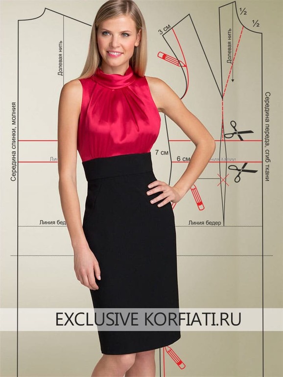 ВАЖНО! Если вы захотите «посадить» это платье на подкладку, верхнюю деталь лифа выкроите по выкройке с нагрудной вытачкой без изменений (!!!)
