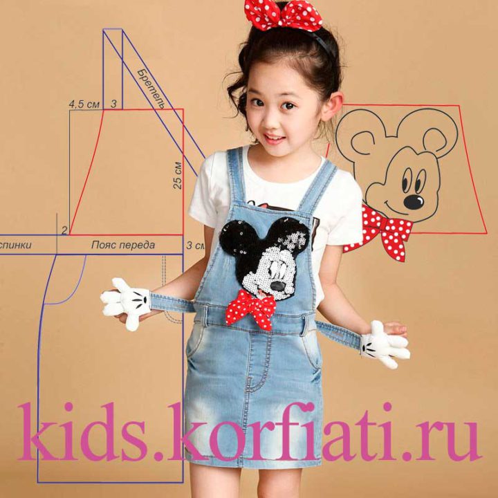 Детская одежда должна быть удобной и яркой, особенно летом! Этот джинсовый сарафан с симпатичной озорной мордашкой мультяшного Микки Мауса обязательно понравится вашему ребенку и станет его любимым. Такая модель с прямой юбкой очень удобна и практична. И у нее есть все атрибуты настоящей взрослой джинсовой вещички - карманы с подрезными бочками, притачной пояс, двойные строчки, имитация гульфика, шлевки и длинные бретели, перекрещивающиеся по спинке и заканчивающиеся озорными лапками. Выкройка джинсового сарафана для девочки - в нашем очередном уроке.