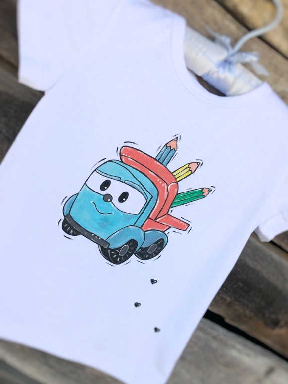 Грузовичок Лёва - ещё один любимый герой маленького мальчугана. Роспись по ткани стойкими красками.