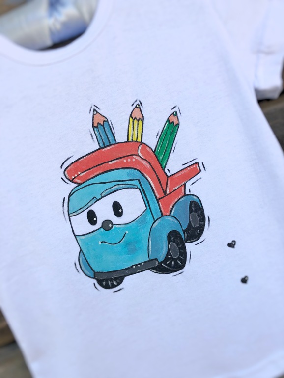 Роспись по ткани, батикГрузовичок Лёва - ещё один любимый герой маленького мальчугана. Роспись по ткани стойкими красками.