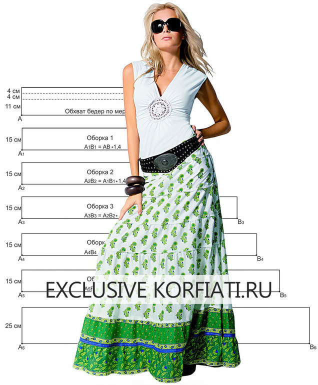 Длинные юбки снова вернулись в моду, и это не может не радовать, поскольку длинная юбка - лучшее решение для жарких летних дней. Такая модель будет надежно защищать ноги от агрессивных солнечных лучей и дарить прохладу. Сшить эту великолепную юбку с оборками не составит труда даже для новичков, ведь даже выкройка вам не потребуется, достаточно выполнить несколько простых математических рассчетов. Мы рекомендуем шить такую модель из легких тканей - поплина, батиста, марлевки, тонкого льна, сатина.
