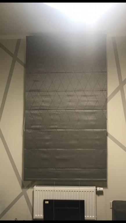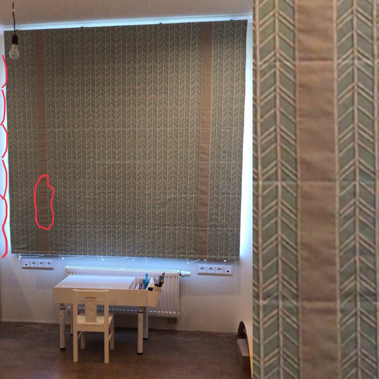 -- вертикальный край у шторы неровный (попыталась изобразить красным, а то не видно так, только если приблизить фото). То есть край идёт как бы дугами между фаберглассовыми вставками (может ловили рисунок, вертикаль которого тоже не совсем ровная - не знаю). Вот тут поближе: