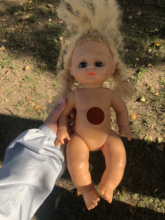 Первым делом я вымыла ей волосы и расчесала. Потом завила утюжком кудри и приклеила глазки (а то один был полуоткрыт, второй работал).