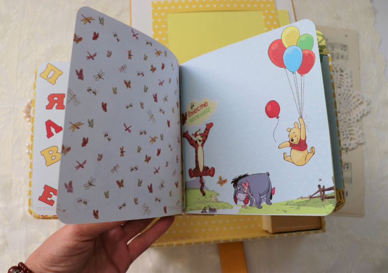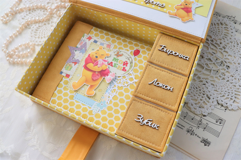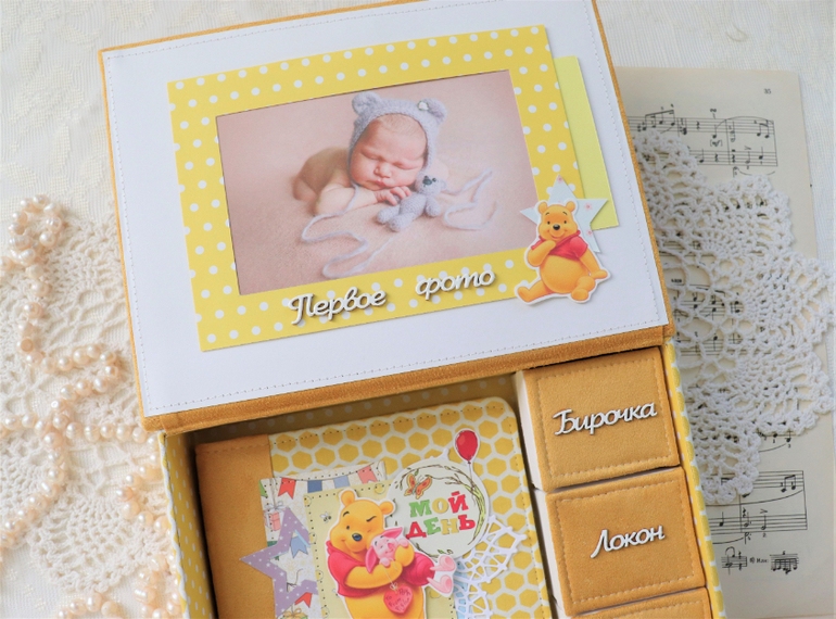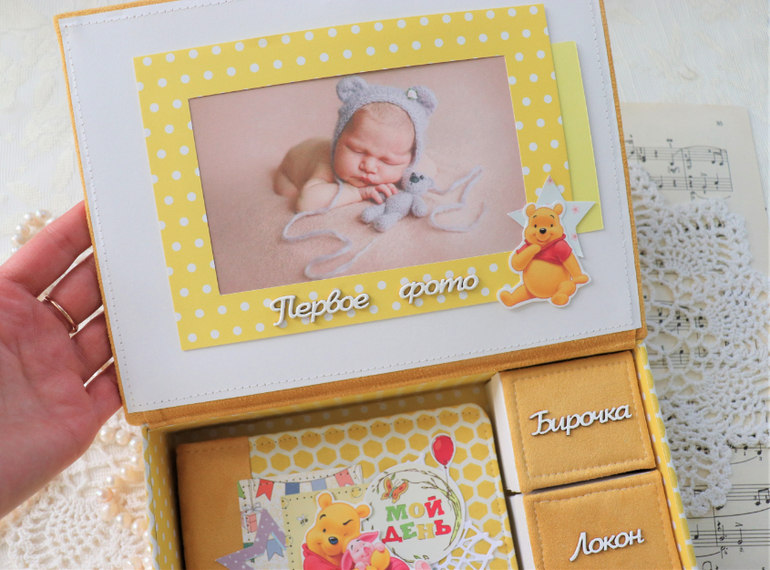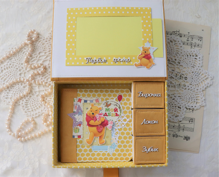 внутри 3 коробочки, рамка для первого фото и мини-альбомчик для первых фото