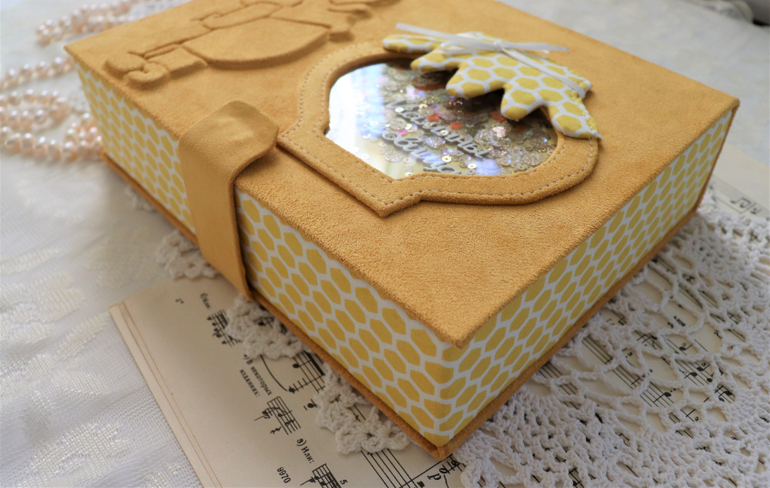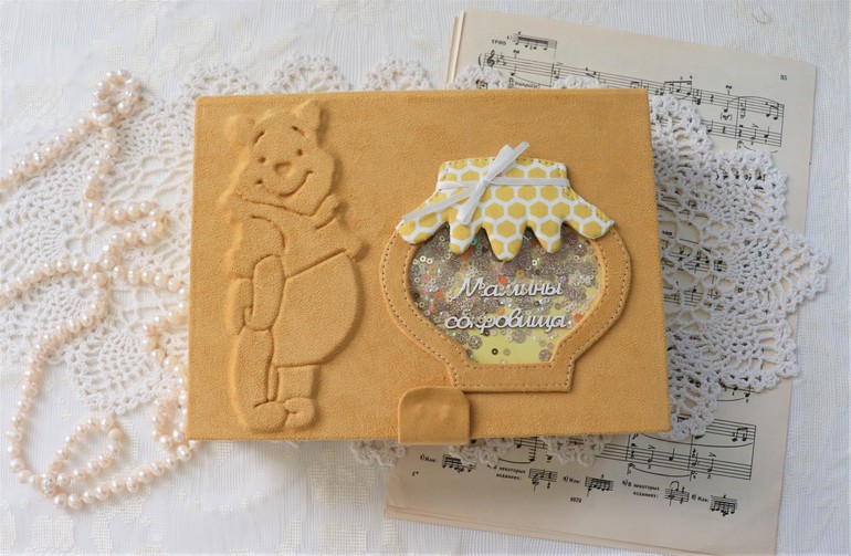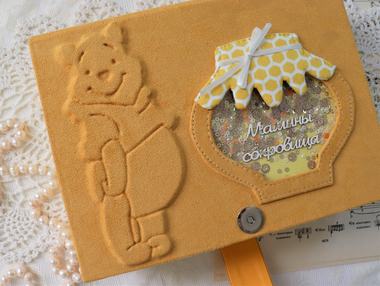 Обложка обтянута замшей, украшена тиснением и шейкером