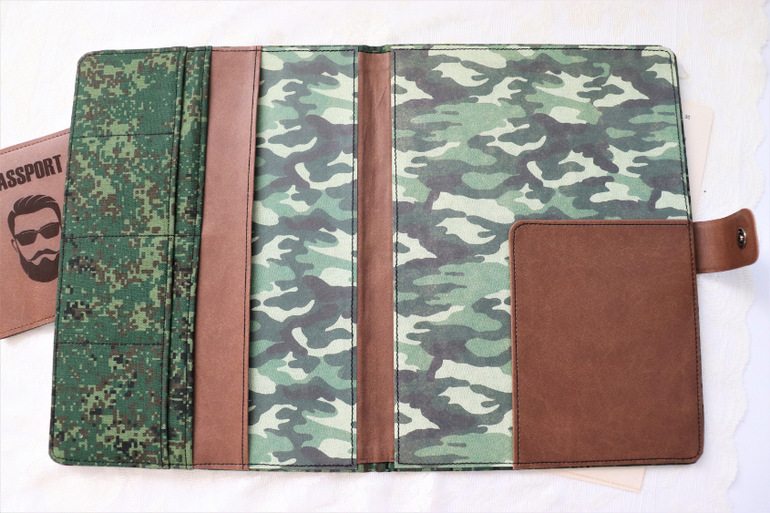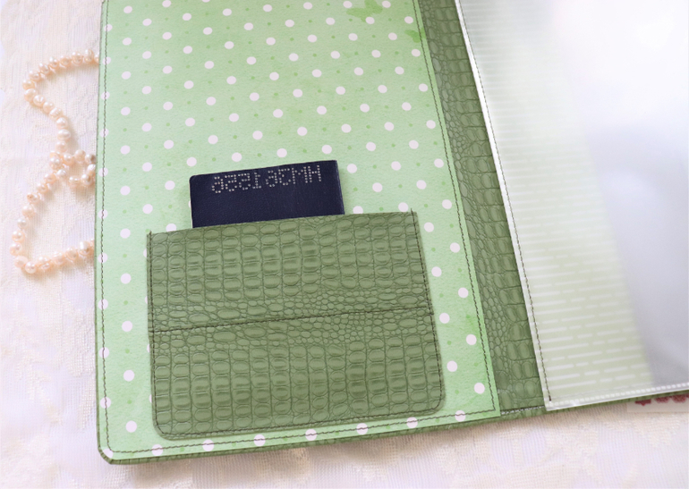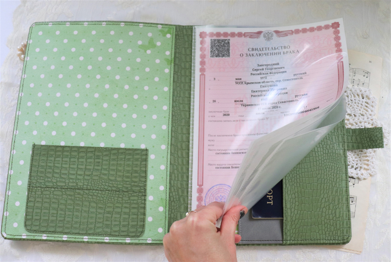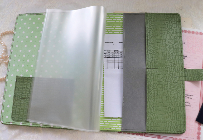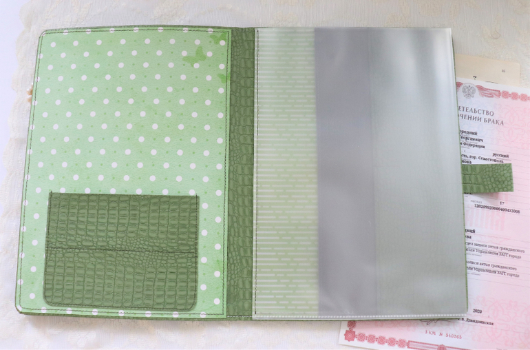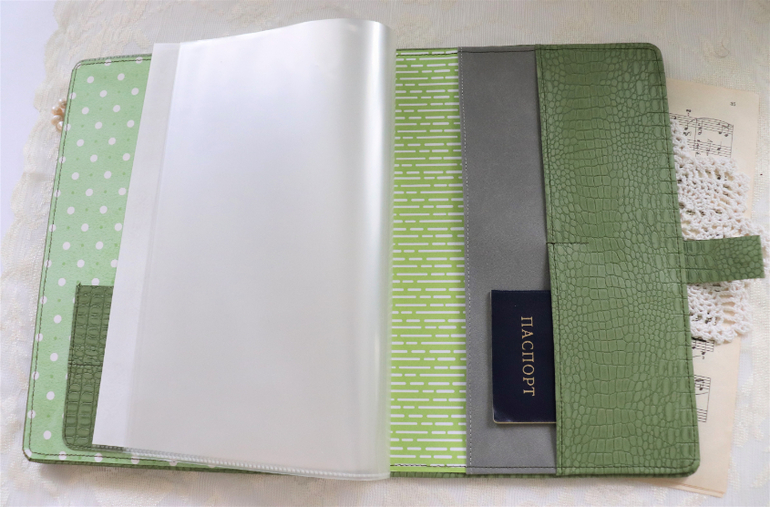 внутри зеленой папки кармашки из кожзама, 5 плотных файлов А4