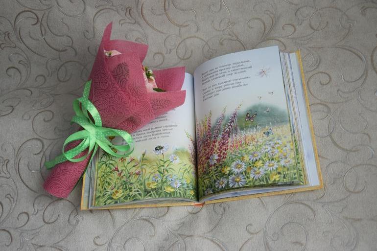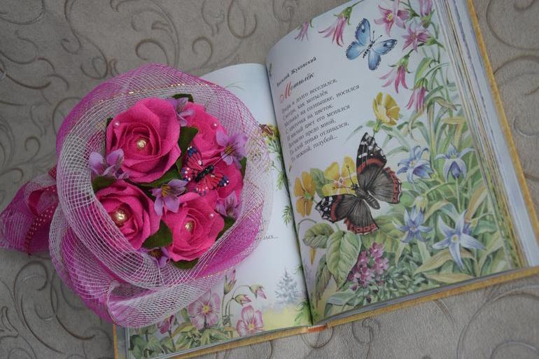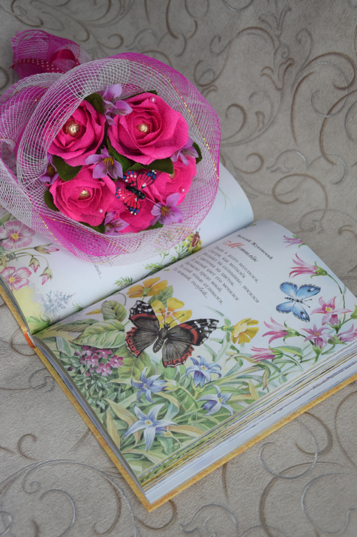 Для первой учительницы Дима выбрал ярко розовый букет с бабочкой: