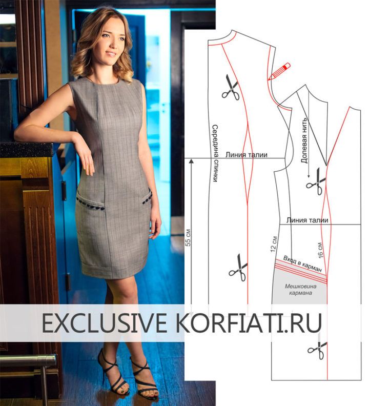 Элегантное облегающее платье в деловом стиле - одна из моделей must-have в гардеробе каждой бизнес-леди. И поскольку деловых платьев много не бывает, предлагаем вам смоделировать выкройку и сшить классическое платье-футляр, которое имеет сразу несколько интересных дизайнерских решений. Изящную архитектуру изделия длиной чуть выше колен создают плавные рельефные швы, начинающиеся от горловины. Карманы с подрезным бочком, декорированные узкими обтачками и обтяжными пуговицами, добавляют платью стильные акценты, а добротная натуральная шерсть в тонкую полоску как нельзя лучше подходит для этой модели. Великолепное решение для изящных женщин! Выкройка платья с подрезными карманами - в этом уроке.