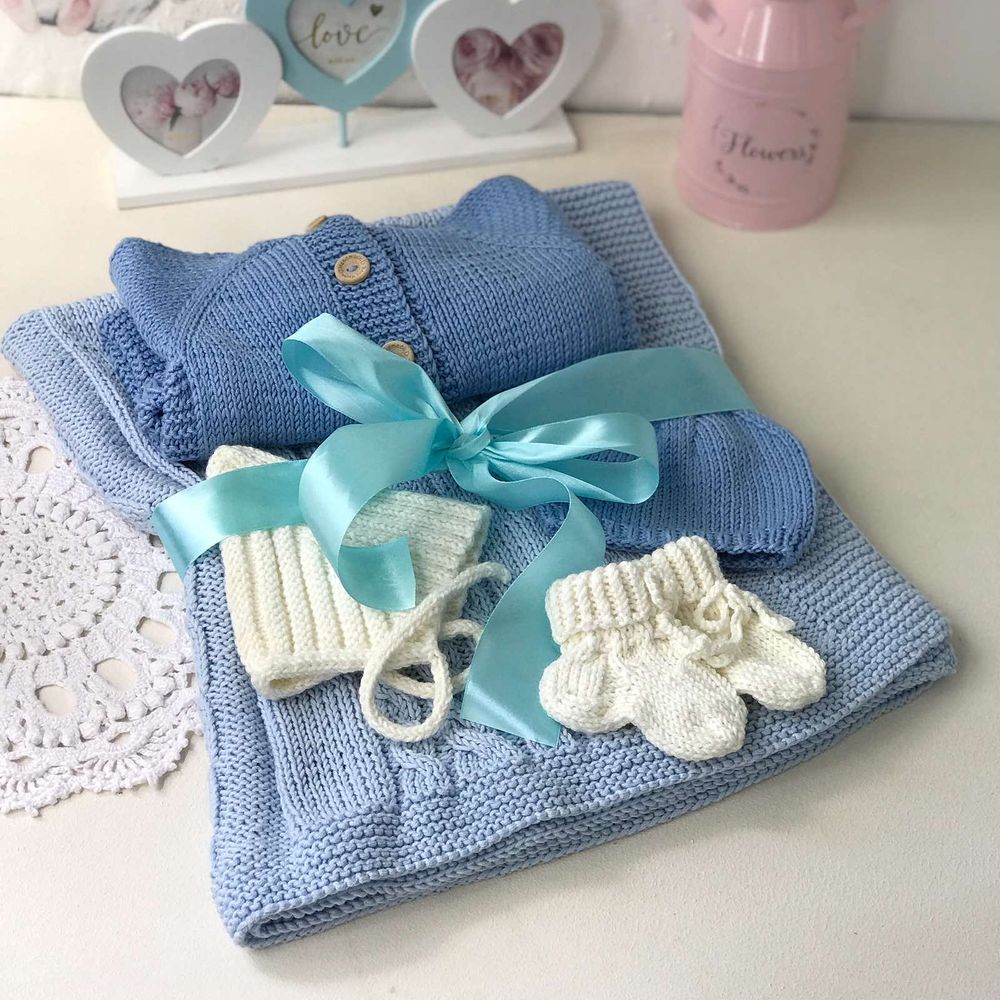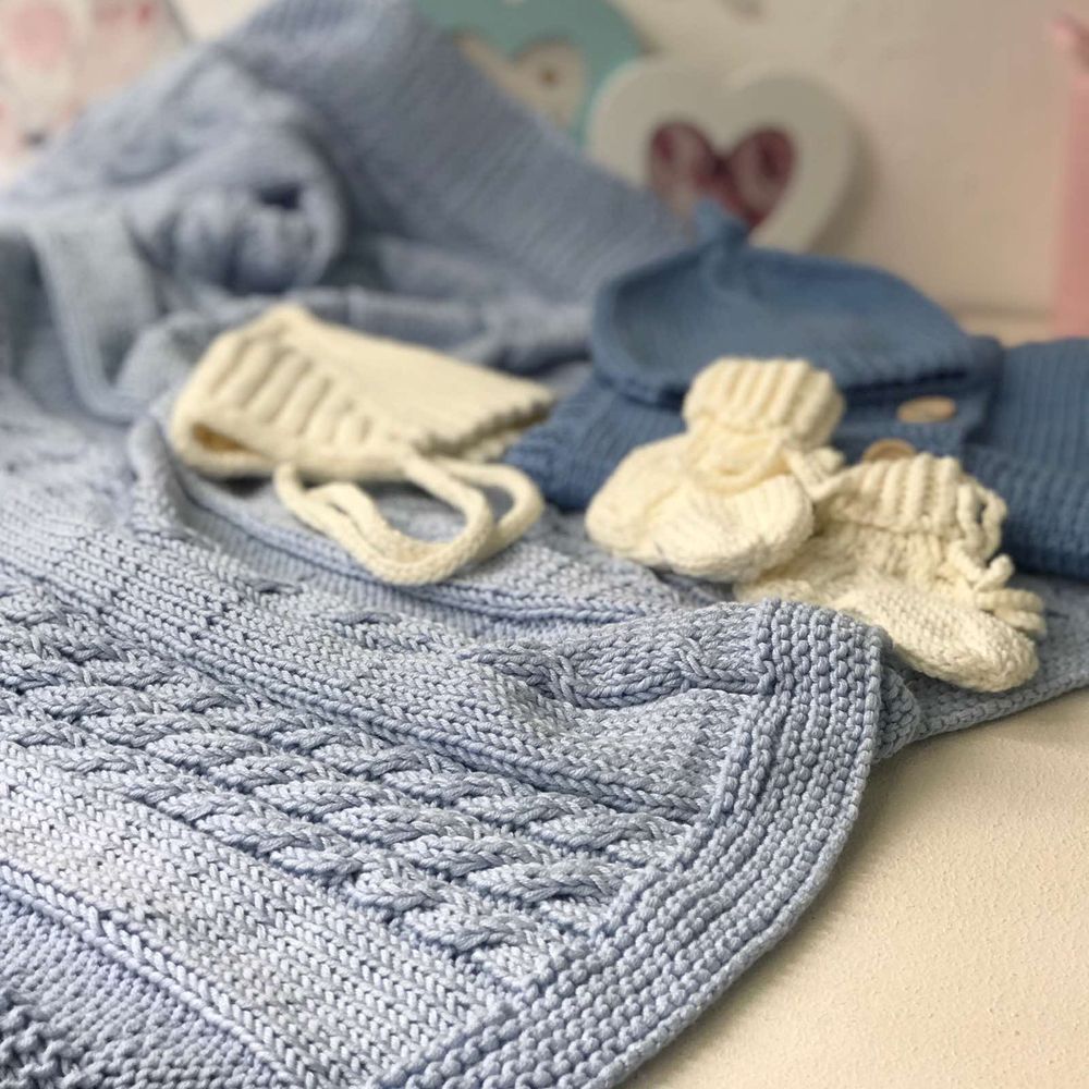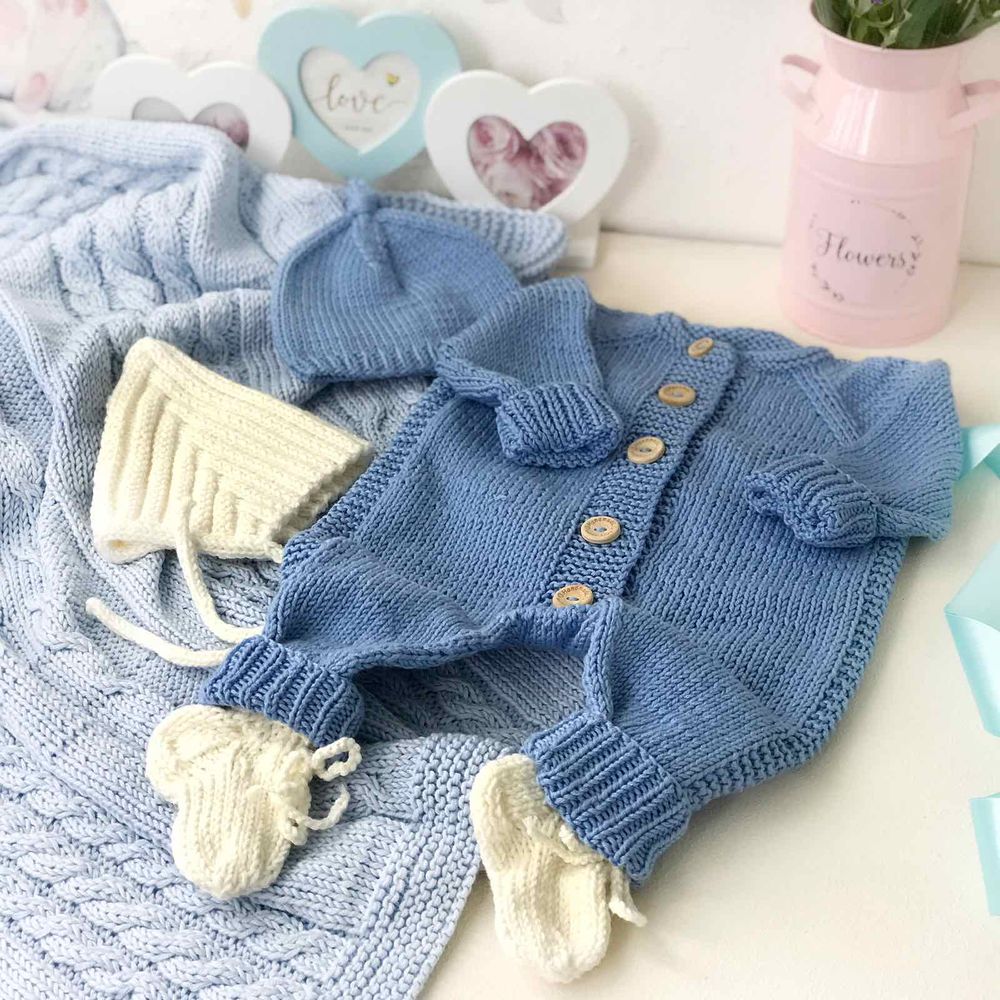 Плед и комбинезон связаны из полухлопка, Газзал беби коттон XL, шапочка-эльф и носочки из мериноса
