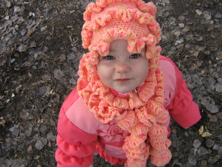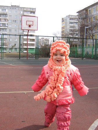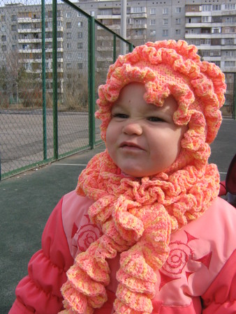 спасибо, только описания нет, сама придумала,обычная шапка крючком, ст без накида, а сверху рюши навязаны- 5ст с накидом в 1 петлю, а шарф путем прибавления петель-250 возд петель, обвязать ст без накида, затем ст с накидом 2 ст в 1 петлю, а след ряд, ст с 2 накидами 2 ст в 1 петлю. Вот и все!