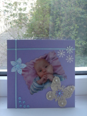 Тут у меня типа дизайнерский картон с тиснением...А надо было бы еще под фотку, как бы рамочку, например голубой картон использовать..но я не подумала...