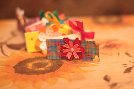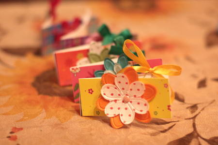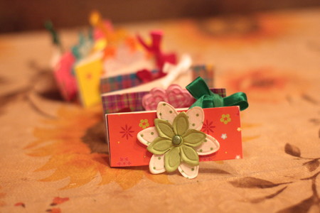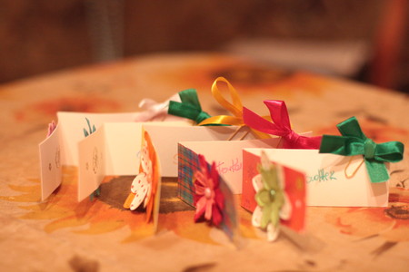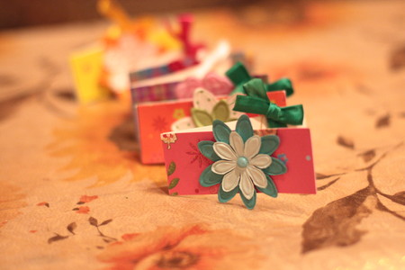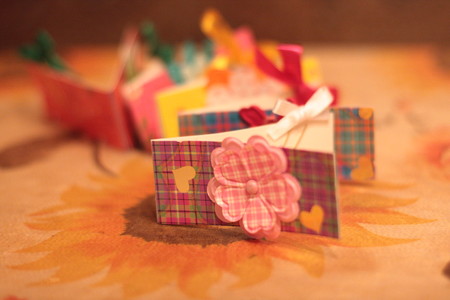 на каждую открыточку приклеила цветочек, на него еще цветочек, бусинку сверху и бантик сбоку. так?