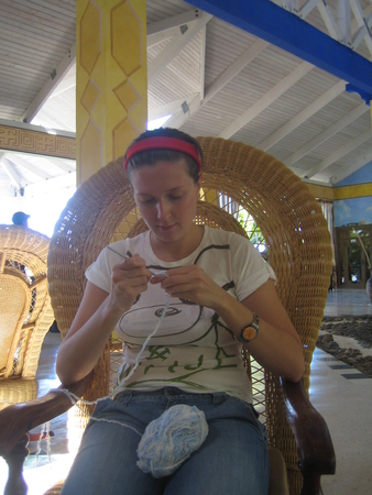 НО! В минуты ожидания, порывшись в чемодане, были найдены самые мягкие и красивые нитки, подходящий крючек! И дело пошло!