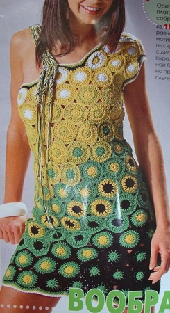 Оригинальное платье собранное из 187 круглых разноцветных мотивов,связанных крючком,с диагональным вырезом и тройной бретелью на правом плече.