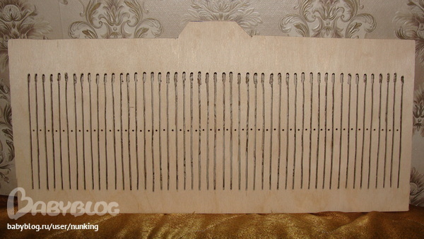 Большое. 50*25 см примерно. Прорези и дырочки должны быть такими, чтоб туда шерстяная нить спокойно вставлялась (плетут в основном из шерсти). Между прорезями расстояние 0,7 см. меньше- потрескается. Муж пилил из куска фанеры.