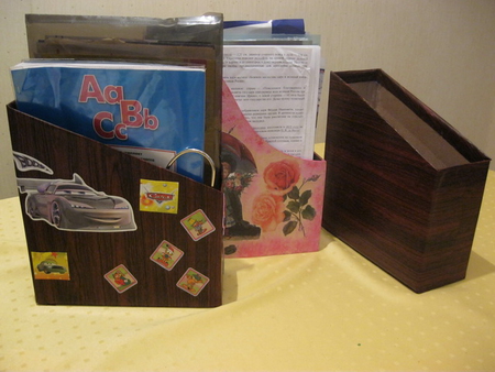 И вуаля наш накопитель для бумаг готов. Декорировать можно по своему усмотрению. У меня сын с удовольствием оформил накопители накляйками и использует их для хранения своих учебных пособий и не только. А я использую для хранения своих распечаток и вырезок с различными советами.