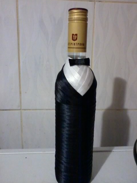 Анна, здравствуйте. Очень вдохновили Ваши работы. На новый год тоже делала шампанское. Раздарила родне--все в восторге. Очень понравилось. Я конечно еще не мастер и возникли вопросы. Вы уже давно занимаетесь оформлением бутылок, подскажите по поводу лент---атласные двусторонние я не нашла у нас в магазинах, а косая бейка удобнее в работе?Пробовала банты с хвостиками по вашему мк, но пока увы, не получается.Пробовала бутылку не шампанского оформить косой бейкой--сложно, но возможно))))и уходит очень много бейки. Вот результат