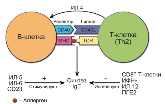 ские механизмы атопического фенотипа. Основную роль в переключении синтеза тяжёлых цепей иммуноглобулинов (см. главу 5) на тип e играет растворимый медиатор ИЛ-4. Кроме того, наряду с ИЛ-4 также необходим второй сигнал, обеспечиваемый прямым контактом с CD4+ Т-хелпером, а именно взаимодействие CD40 на активированных Т-клетках с рецептором для CD40 на В-клетках. Функциональный антагонист ИЛ-4 - ИФНу. Действуя на те же самые механизмы, он угнетает выработку IgE. Подавляют синтез IgE также ИФНα, ТФРβ, ИЛ-8, ИЛ-12