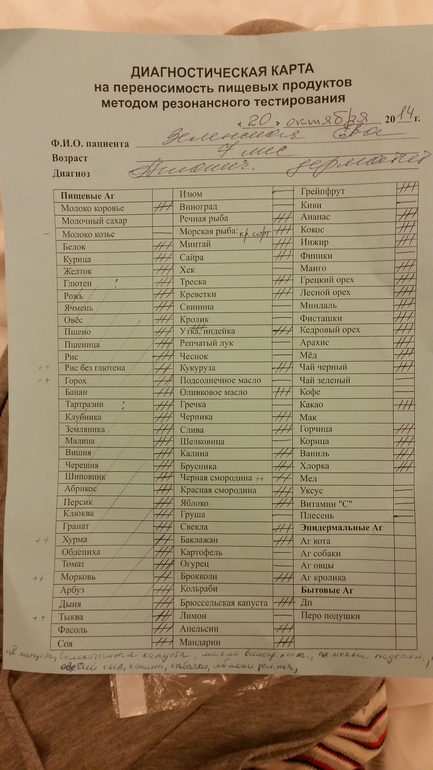 Добавляю фото с диагностики и лечения, а также список продуктов, который стандартно диагностируют. Если чего в нем нет, можно сразу же на диагностику, как я и писала, довезти другие продукты.