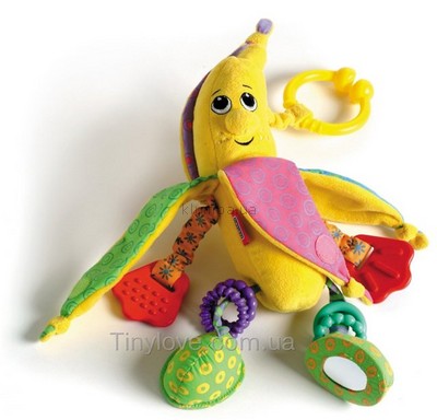 2.Банан Тини Лав, пожалуй, одна из самых известных игрушек, шуршит, издает интересный звук при потрясывании, ручки на резиночках, на ножках зеркальца. Есть прорезыватель, липучки, кольцо-крепление. 200 руб.