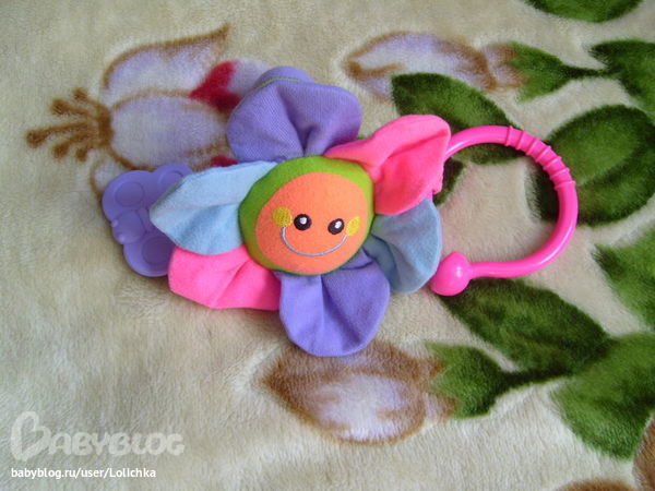 3. Цветочек Тини Лав. Тоже интересная игрушка. Главное достоинство - она вкусно пахнет, цветочек же! Даже после стирки. Внутри погремушка, листики шуршат, есть прорезыватель и кольцо-крепление. 200 руб.