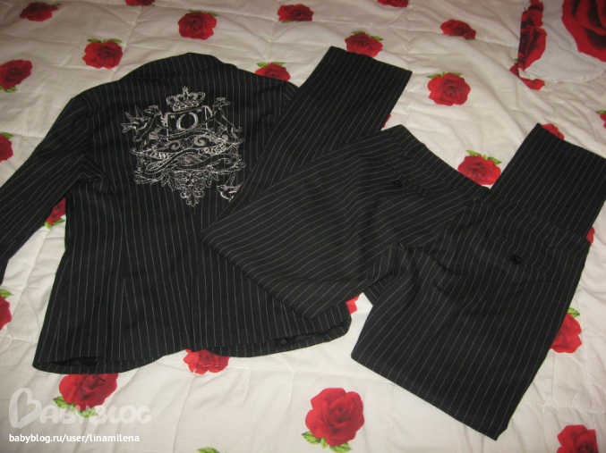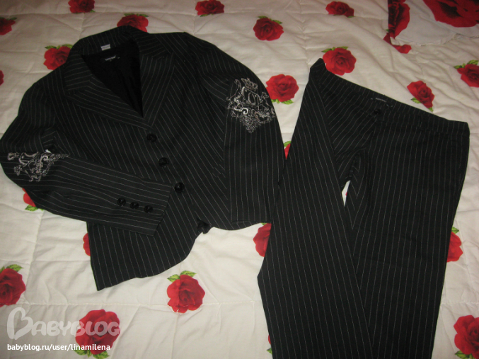 Костюм одет от силу два раза, купила и забеременела... теперь лежит, на работу не собираюсь, носить некуда( хранить не буду)) размер М, на 46, сидит обалденно, брюки с низкой посадкой, очень здорово на попе смотрятся, короче говоря крутяцкий костюм блин))) 2500р
