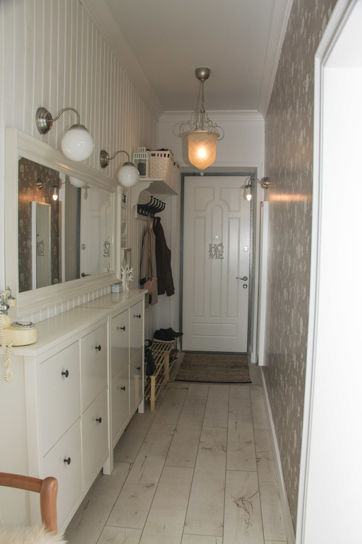 Длинный такой коридор, сначала мне это казалось минусом, но сейчас я понимаю что удобно, много вещей можно повесить на вешалки, много обуви. В галошницах, шапки и шарфы, детские портфели, все спрятано,