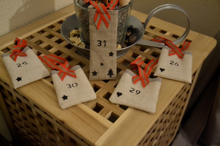 Девочки всем привет! делюсь с вами своей рукотворной новинкой - адвент календарем! Пришло вдохновение после просмотра нескольких рождественских постов)) и за сутки я его сотворила! долго думала над количеством мешочков - 31? меньше? а сколько? в итоге остановилась на 7 днях - последняя неделя декабря с 25 по 31 - самая волнительная для ожидания Нового года! в процессе рисования цифр меня осенило, что на обратной стороне можно нанести цифры с 1 по 7 число, что будет обозначать отсчет после нового года до нашего Рождества 7 января! Надо просто перевернуть после 31 декабря мешочки и готов "новый" адвент))) я счастлива!