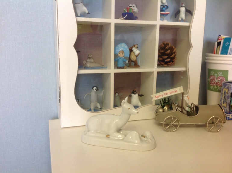 Летом у бабушки выциганила двух фарфоровых оленей затертого года выпуска. Одного Никита разбил, играя с ними в зоопарк, жалко! Теперь одинокий рогатый зверь будет украшать нашу новогоднюю квартиру)