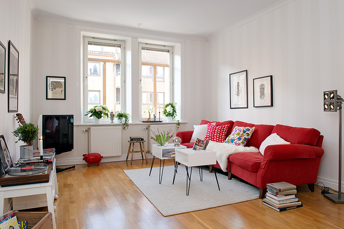 Очень приятен глазу своими белыми стенами и яркими акценатми, но получается какая-то обезличенность. А все потому, что эта квартира пока нежилая, а выставляется на продажу. Вот так работает известная шведская риелторская компания. Покупает контракт с человеком на продажу его квартиры, половину выкидывает, половину перекрашивает в белый и продает. По статистике, жильцы , вселившиеся в такую квартиру всем довольны и меняют только белье!