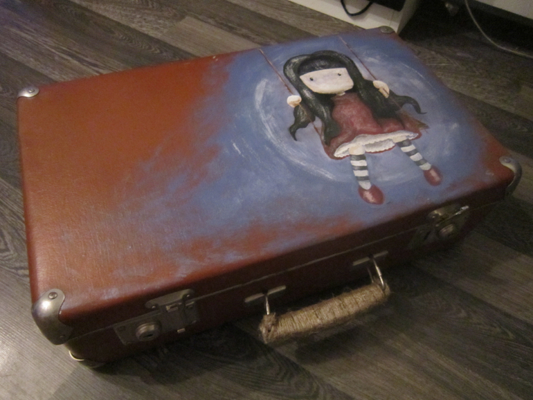 ...Ткань клеяла простып ПВА...Первоначально чемодан был обклеян бумагой, так что ткань к нему хорошо приклеилась!!Картинка срисована с работы Сьюзен Вулкотт...Мне оч нравятся её картинки и я часто их срисовываю в интерьер!!