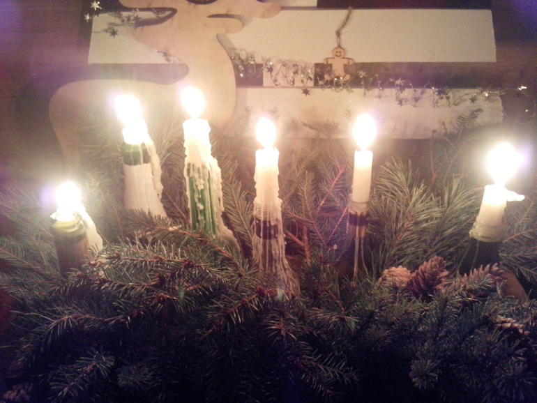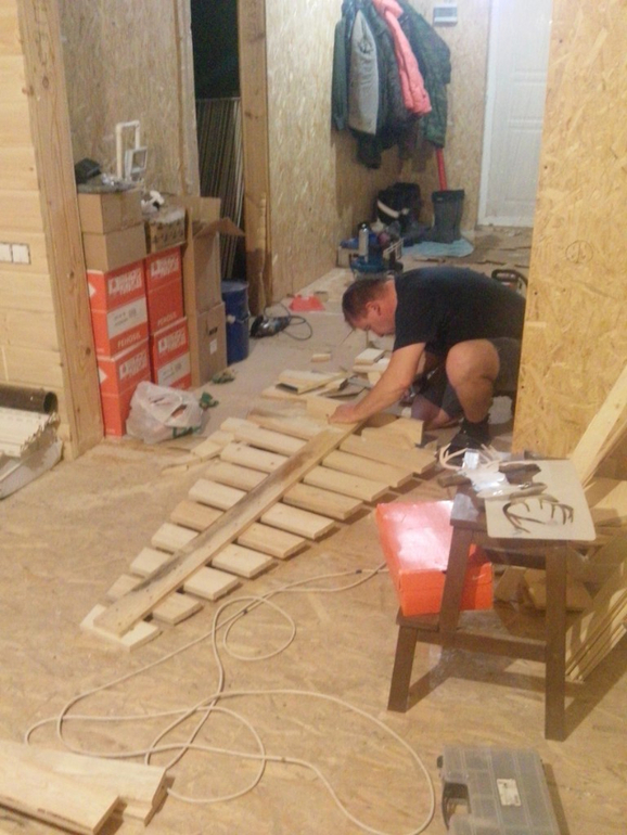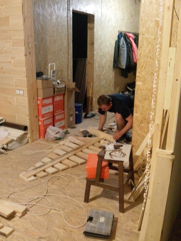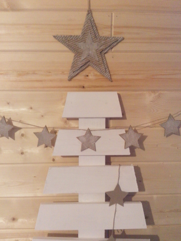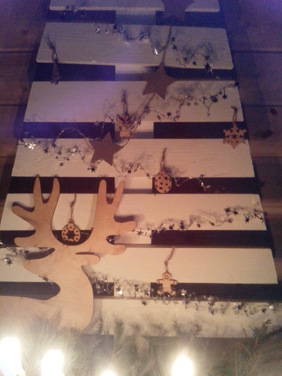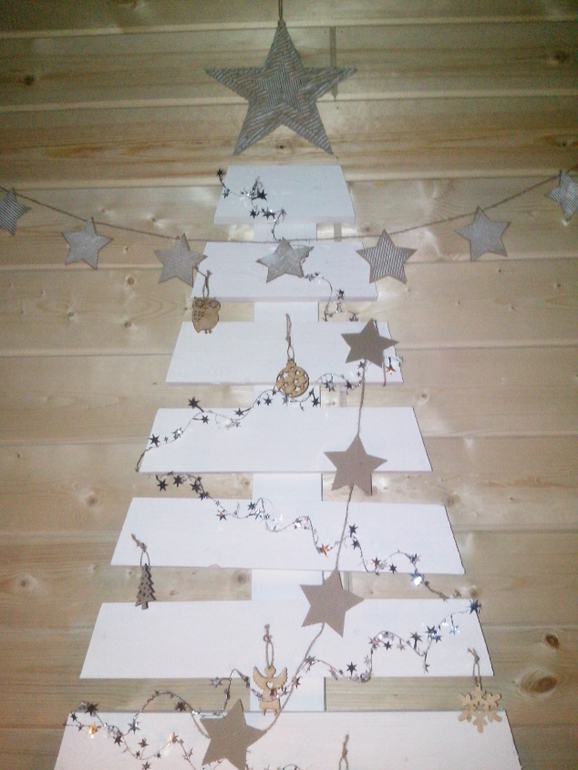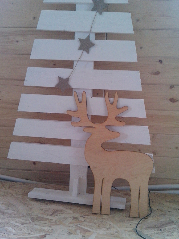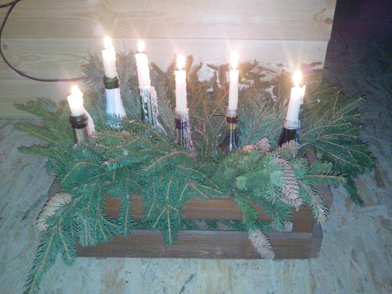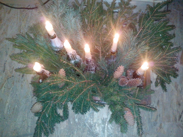 Украшение к праздникуЭтот новый год мы с мужем решили отметить в новом доме. В доме предстоит еще огромный ремонт, но это нам совсем не помешало. Хочу в дизайне дома определить скандинавский кантри стиль. Но, до этого еще далеко. Долго думала какую поставить елку. Настоящую стало жалко, постоит, порадует недельку-вторую и выкинуть? Ужасно жалко. На искусственную елку денег не хватило (с ремонтом). И я решила сделать елку своими, т.е. руками мужа. Нашла на просторах интернета примерно ту, которую хочу и показала фото мужу. 30 декабря муж елку смастерил, я ее покрасила. Игрушки и оленя сделали на заказ, звезда сделана моими руками. Ящик сколотили на работе, я его покрасила морилкой. Ветки купила на рынке, бутылки остались после корпоратива. Осталось только собрать композицию. Фото с сотового, так что качество никакое.И вот что получилось.