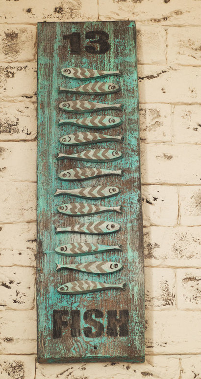 ! Деревяшка- искусственно состарена, рыбки сделала из соленого теста. Сделала шаблон рыбки из бумаги , раскатала пласт соленого теста примерно 3-4 мм толщиной, и ножом по шаблону вырезала рыбок. Потом сушила дня 3-4, они немного деформировались, но не критично. Когда подсохли ошкурила наждачкой, разрисовала и приклеила на термопистолет. Вот и все. Будут вопросы- пишите.