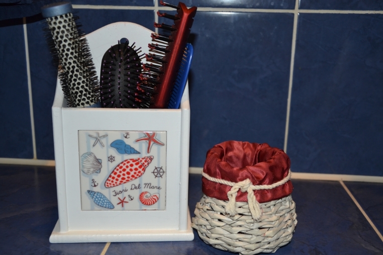 А это еще одни мои любимицы - ящик куплен давно в Красном кубе на распродаже, а корзиночку сплела старшая дочка - там хранятся бантики-резиночки))